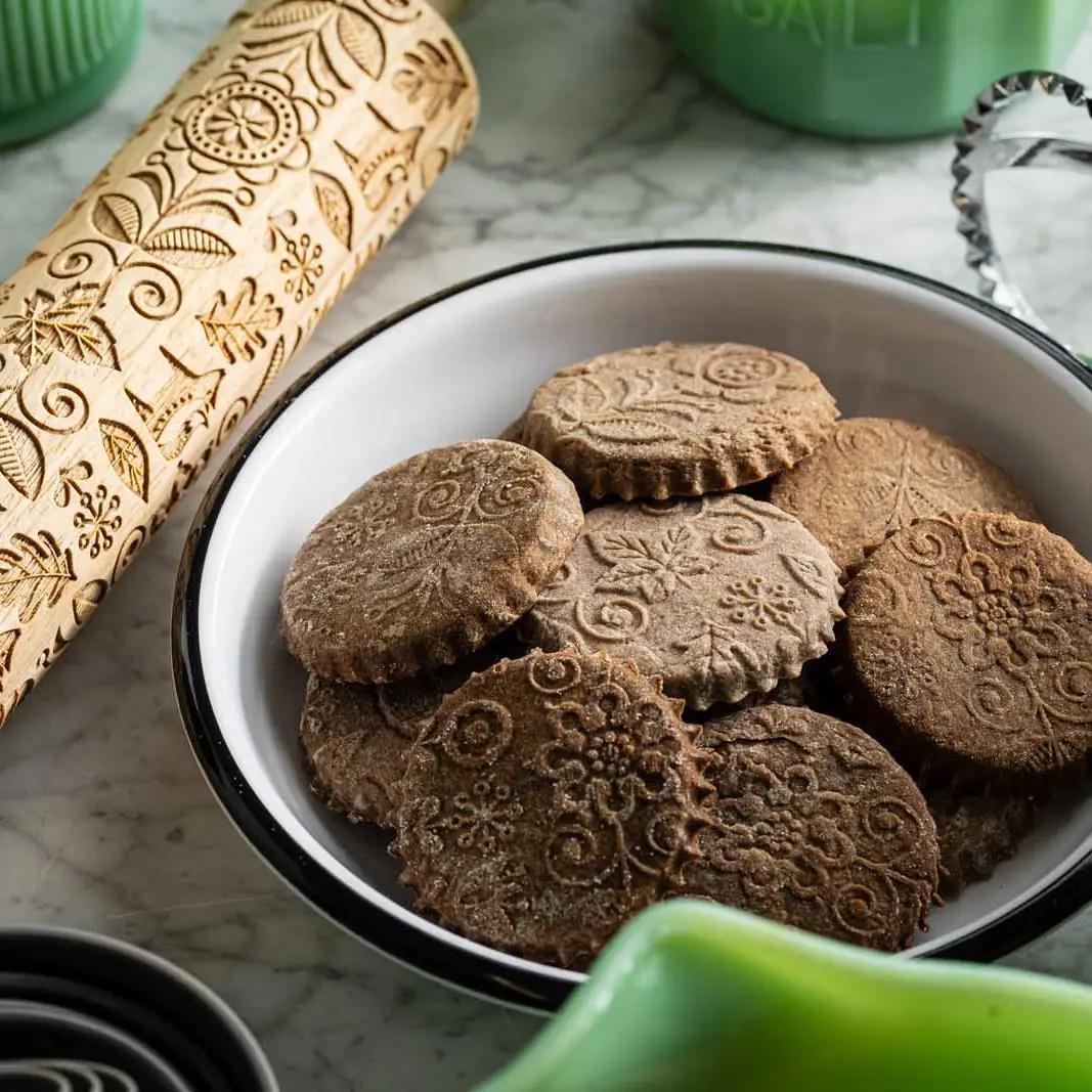 Create festive shortbread, sugar, or gingerbread cookies for your next party or holiday cookie exchange with our Embossed Rolling Pins, featuring three exclusive designs. These versatile pins are perfect for more than just cookies—use them to craft decorative fondant or marzipan for cakes, add intricate patterns to pie crusts, emboss fresh pasta sheets or bread dough, or even for creative projects like air-dry clay and soap making. For the best results, chill your dough to prevent sticking and ensure crisp patterns. Lightly dust the rolling pin with flour or powdered sugar, and apply even pressure for beautifully consistent designs.