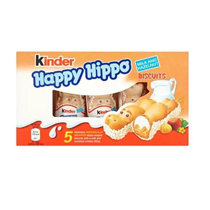 Kinder Happy Hippo is a crispy hippo shaped biscuit with a double cream filling. It is available in two different, yummy flavors - cocoa and hazelnut.