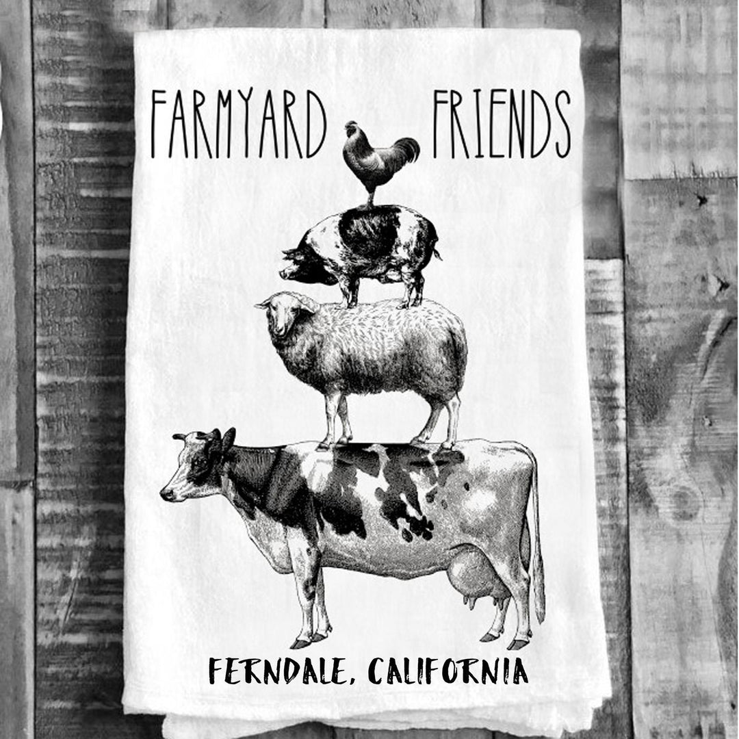Cotton Tea Towel - Cow Sheep Pig Chicken "Farmyard Friends Ferndale California"