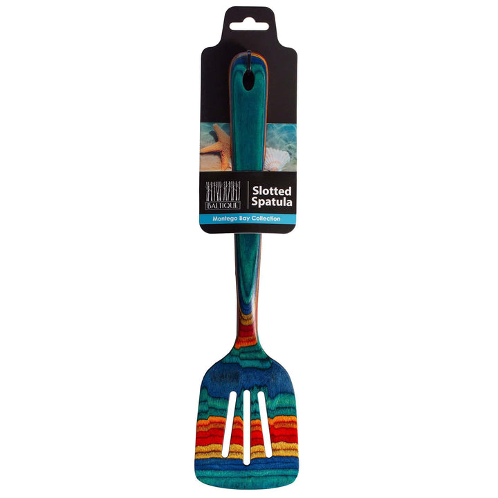 The Montego Bay collection is inspired by the relaxing sunsets on the shores of the Jamaican vacation destination. The blend of cool teal, deep blue, golden sand, sunset red and vibrant orange will add a wonderful splash of color to your home. This beautiful slotted spatula is great as both a functional turner for flipping and turning food as well as for serving guests.