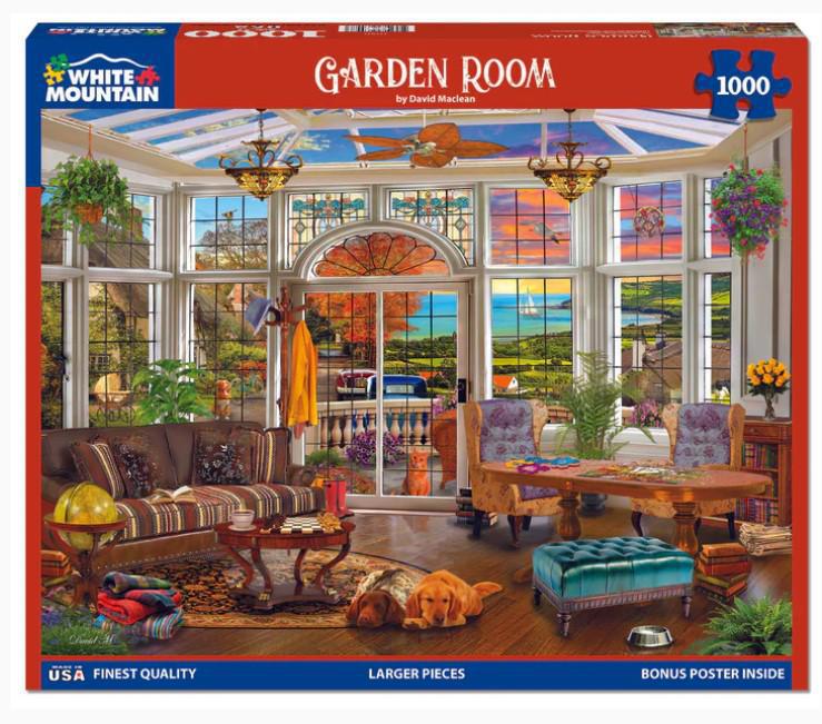 Inside the conservatory, the dogs rest in the warmth provided by the sun while the cat peeks through the door waiting to be let in. Take a seat on a high-backed chair and continue your puzzle. When you need a break, simply turn and watch the sailboats in the harbor or gaze out the crystal-clear windows and enjoy the colors created in the sky by the setting sun.  Designer David Maclean offers an ocean view no matter where you are in this 1000 piece jigsaw puzzle. Finished size 24” x 30”.