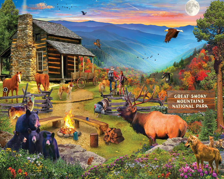 Hikers admire the view from the mountain top. The forest residents came out to welcome their visitors. Elk, bear, coyote, and more are at the edge of the woods enjoying the warmth of the fire. A chipmunk gets close while a coyote hides in the brush nearby, curiously watching what the visitors are doing. Artist David Maclean offers a majestical view of the Smokey Mountains National Park in this 1000 piece jigsaw puzzle. Finished size 24" x 30".