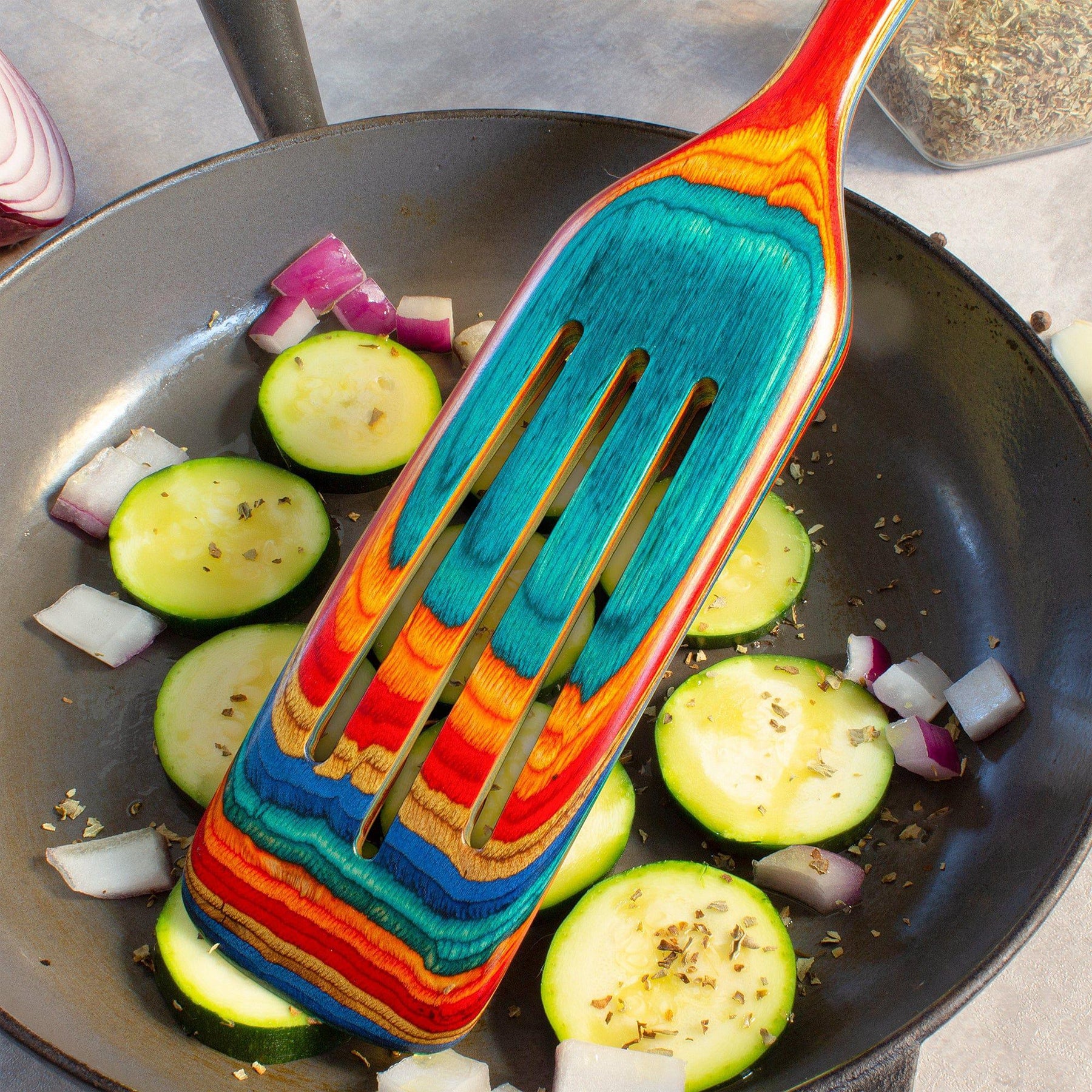 This distinctive utensil is masterfully crafted from layers of colored birch wood to create a gorgeous color array.