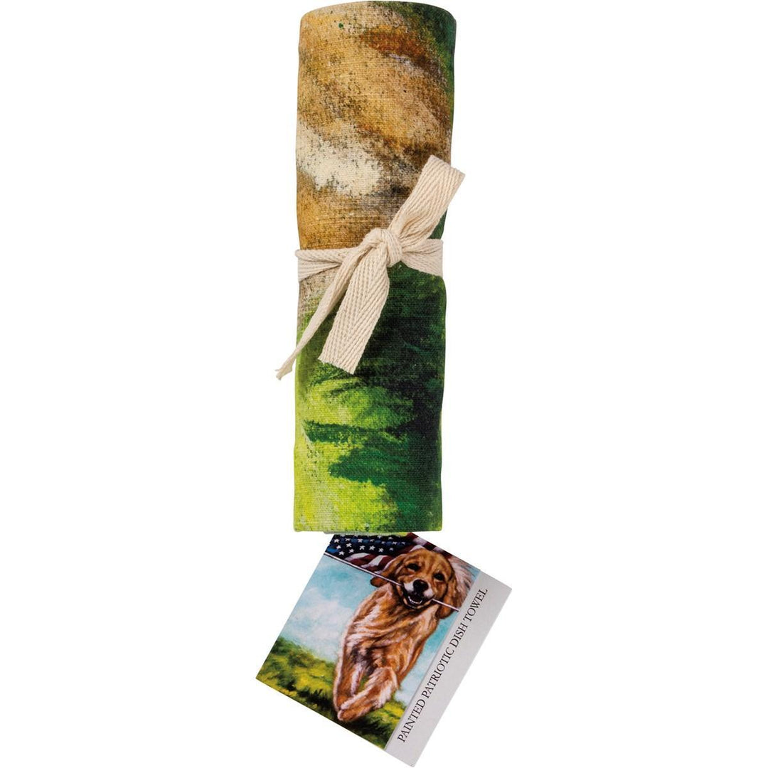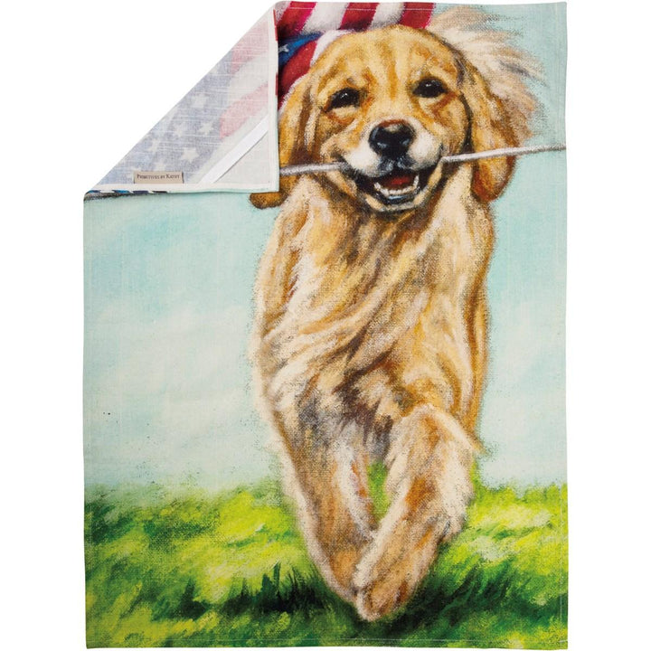 A cotton kitchen towel featuring an all-over design of a dog running with an American flag. design is replicated from original artwork painted onto burlap canvas, giving the art a unique depth and texture. Towel features cotton tape loop in corner for easy hanging.