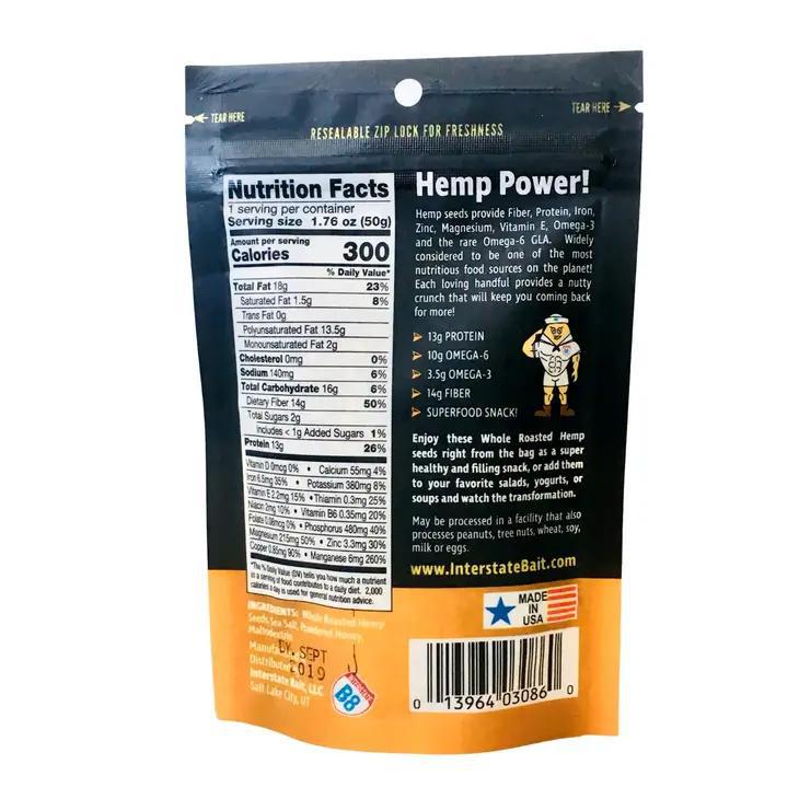 INGREDIENTS: Roasted Whole Hemp Seeds, Sea Salt, Powdered Honey, Maltodextrin.